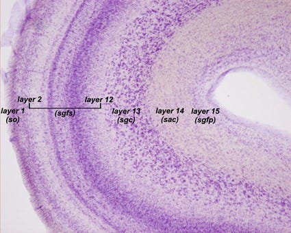 This region can be subdivided further, but frankly there is not enough data to determine the function of each of the proposed FIFTEEN layers. Two will make due.