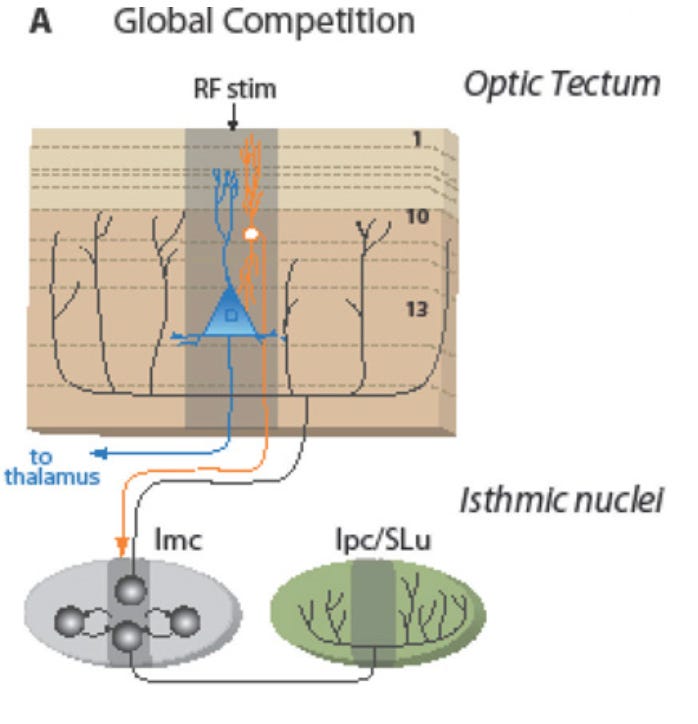 The blue neuron in this image represents one of the neuronal columns I referred to prior. The two Isthmic Nuclei – Imc and Ipc/SLu – are responsible for the global inhibition as seen by the black neuronal fibers that reach into the Optic Tectum. The Orange neuron depicted is a neuron that accompanies each column that senses excitation for the Isthmic Nuclei so it can induce the “competitive surround”.